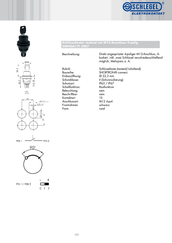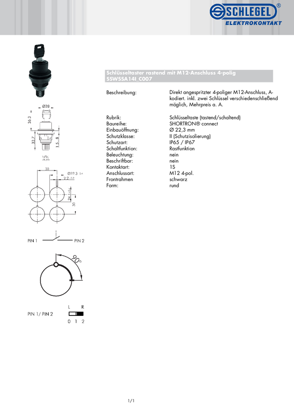 Schlegel SSWSSA14I_C007 SSWSSA14I_C007 Przycisk kluczykowy manualne, klucz 1 szt.