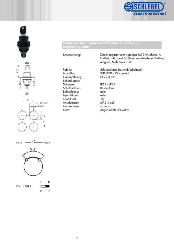 Schlegel SSWSSA18I_C007 SSWSSA18I_C007 Przycisk kluczykowy manualne, klucz 1 szt.