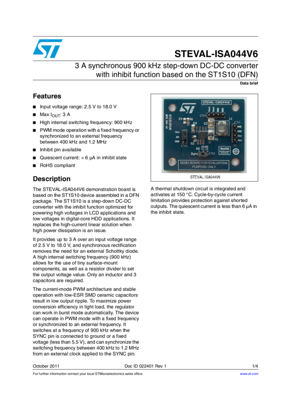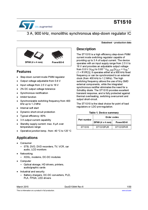 3 A synchronous 900 kHz step-down DC-DC converter with inhibit function based on the ST1S10 (DFN)