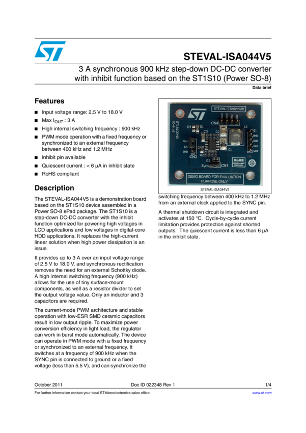 3 A synchronous 900 kHz step-down DC-DC converter with inhibit function based on the ST1S10 (Power SO-8)