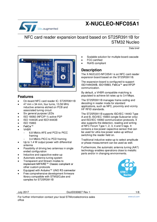 NFC card reader expansion board based on ST25R3911B for STM32 Nucleo