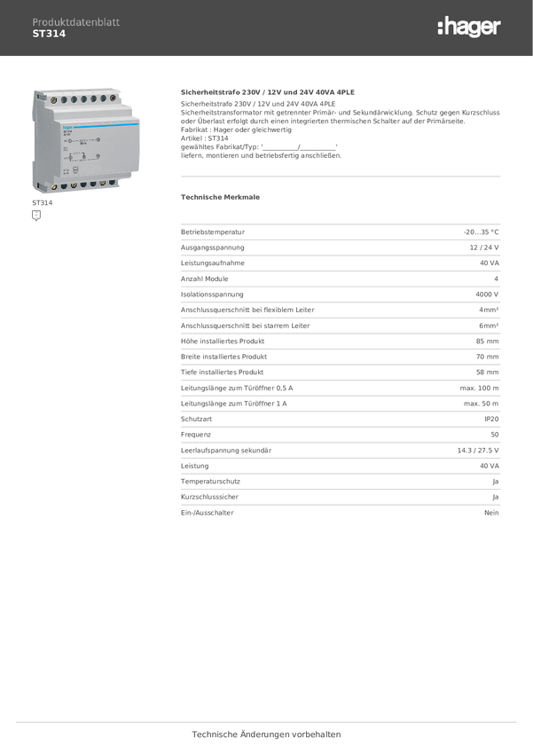 Transformator bezpieczeństwa Hager ST314, 12 V, 24 V