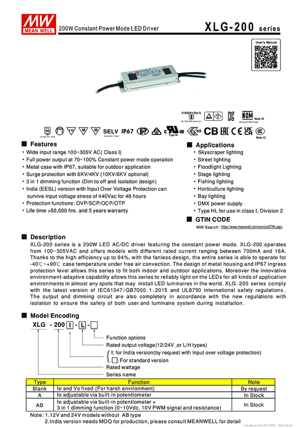 MEAN WELL XLG-200-12-A Sterownik LED Stałonapięciowy, Stałonaprądowy 192 W 8 - 16 A 12 V/DC Możlowość stosowania w mebla