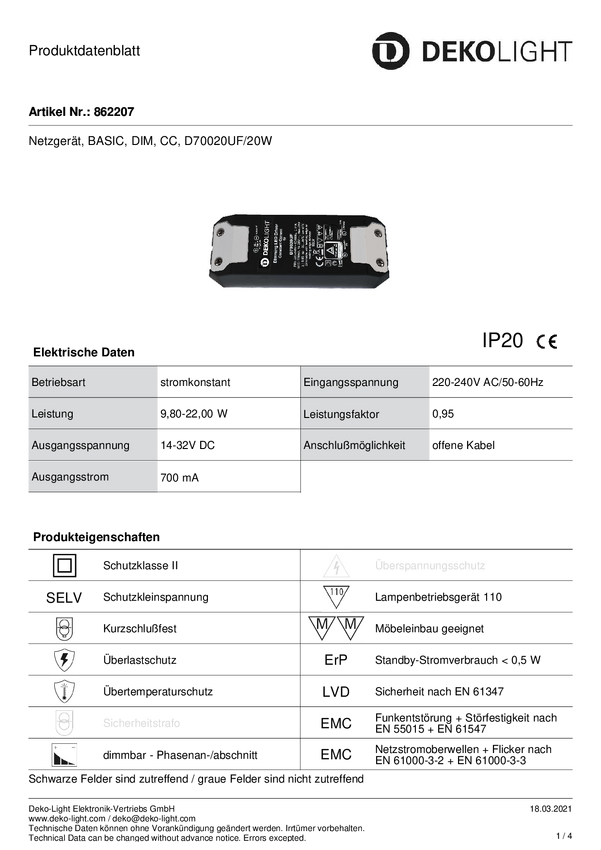Deko Light Basic DIM CC Transformator LED Stałonaprądowy 20 W 700 mA 14 - 32 V 1 szt.