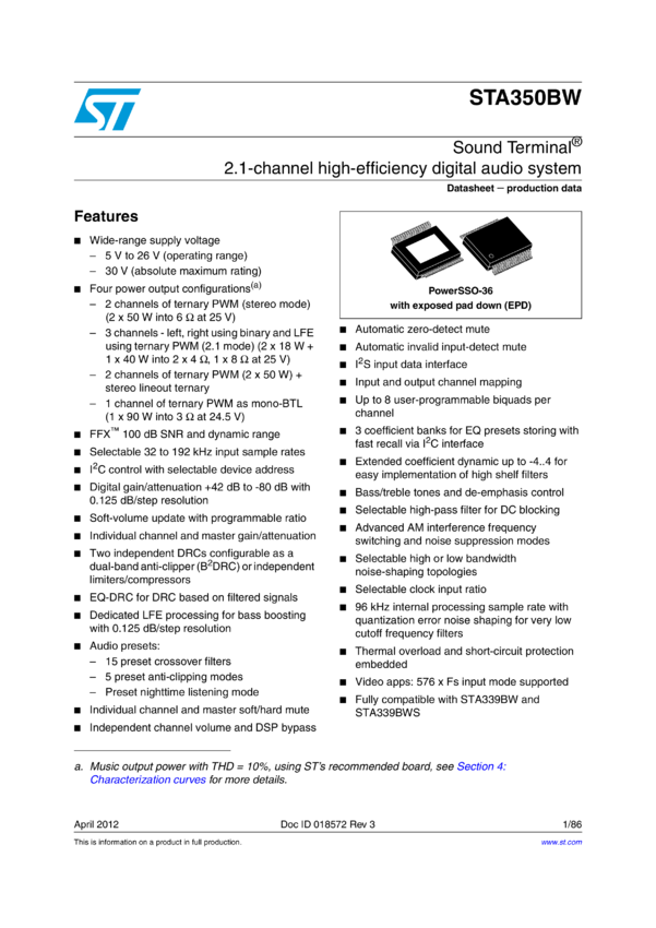 STA350BW Sound Terminal™ 2.1-channel high-efficiency digital audio system board