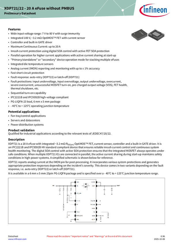 Stackable 20 A, 3.2 mΩ electronic fuse (eFuse) for 7V to 80V DC rails in a small LIQFN-23 package Infineon's XDP722-001 eFuse integrates a hot-swap controller, a low RDS(on) FET with up to 20 A current carrying capability, and a current sense in a small 6 mm x 5 mm package. With its wide operating voltage range, and extensive list of protection features against e.g., inrush current, under- and overvoltage, and overcurrent, it is especially suitable for 48 V/54 V (AI) server/data center and fan control appl