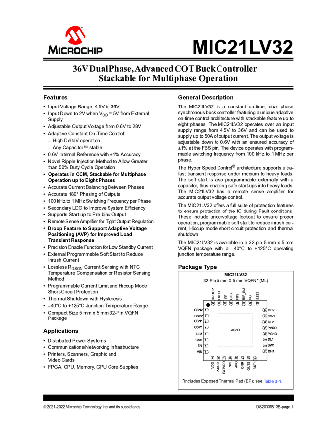 MIC21LV32 36V, Dual Phase COT Buck Controller Stackable for Multiphase Operation