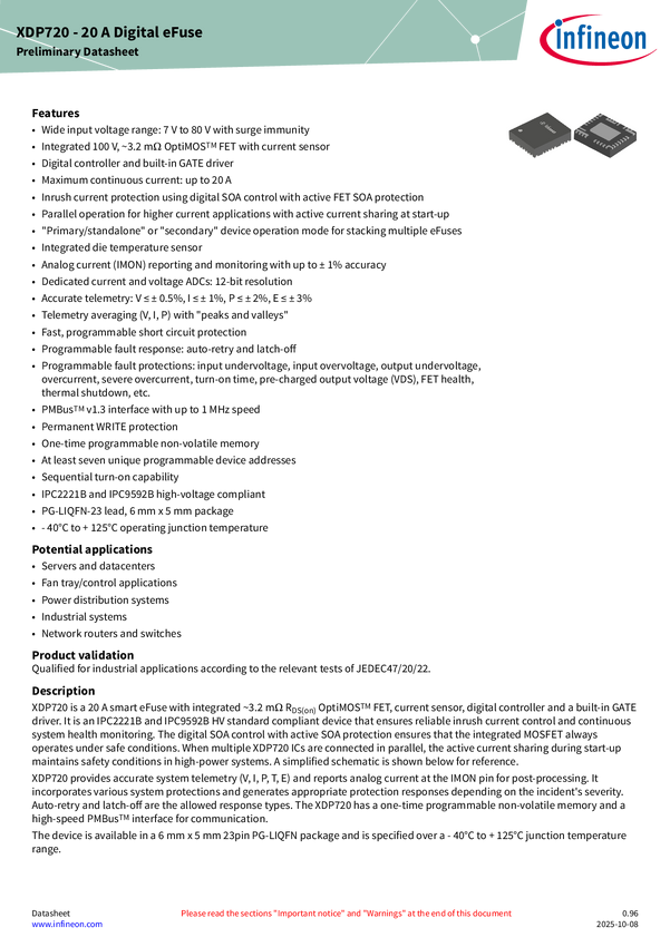 Stackable 20 A, 3.2 mΩ electronic fuse (eFuse) with PMBus® interface for 7V to 80V DC rails in a small LIQFN-23 package Infineon's XDP720-001 eFuse integrates a hot-swap controller, a low RDS(on) FET with up to 20 A current carrying capability, and a current sense in a small 6 mm x 5 mm package. With its wide operating voltage range, Surge Immunity, telemetry, and extensive list of protection features against e.g., inrush current, under- and overvoltage, and overcurrent, it is especially suitable for sophi