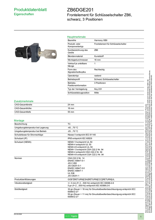 Schneider Electric ZB6DGL Przełącznik kluczykowy (stacyjkowy), przedni element 1 szt.