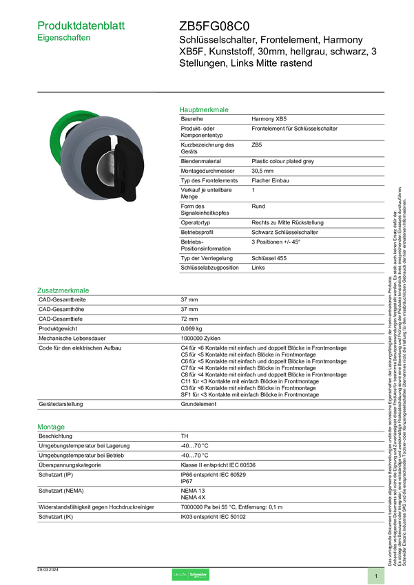 Schneider Electric ZB5FG0C0 Przełącznik kluczykowy (stacyjkowy), przedni element 1 szt.