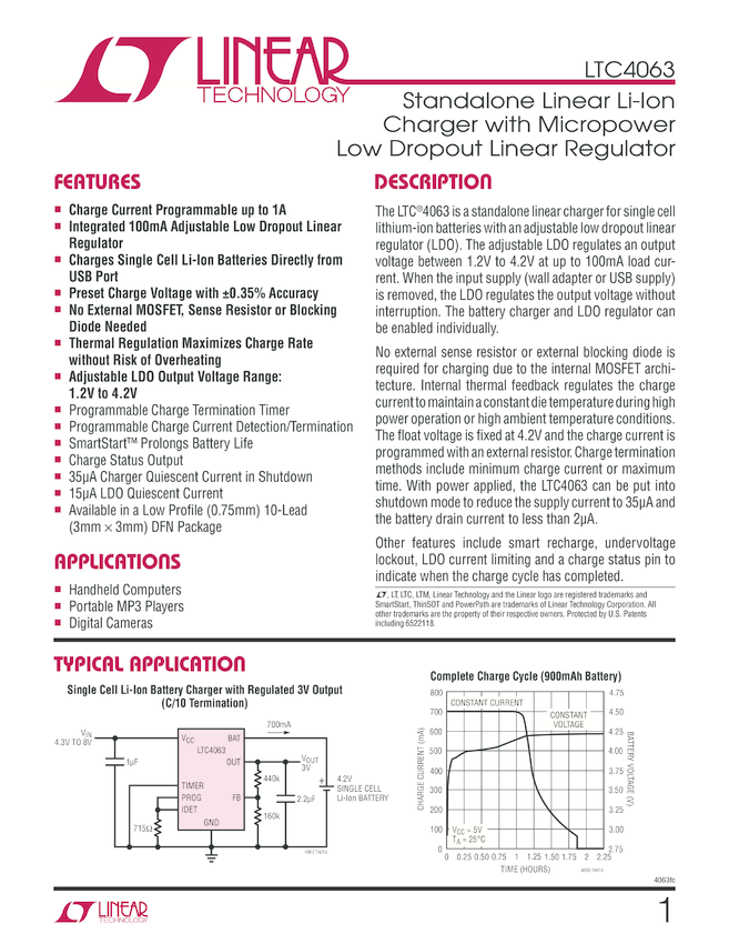 Standalone Linear Li-Ion Charger with Micropower Low Dropout Linear Regulator