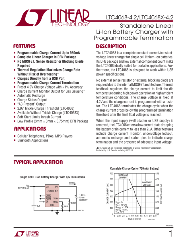 800mA STANDALONE LINEAR Li-Ion Battery charger with therminal regulation
