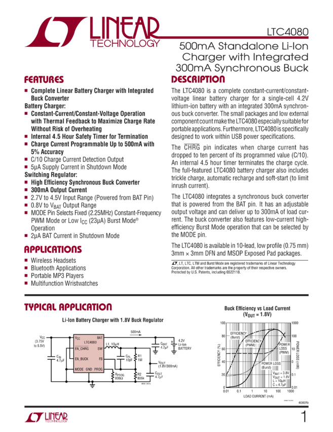 500mA Standalone Li-Ion Charger with Integrated 300mA Synchronous Buck