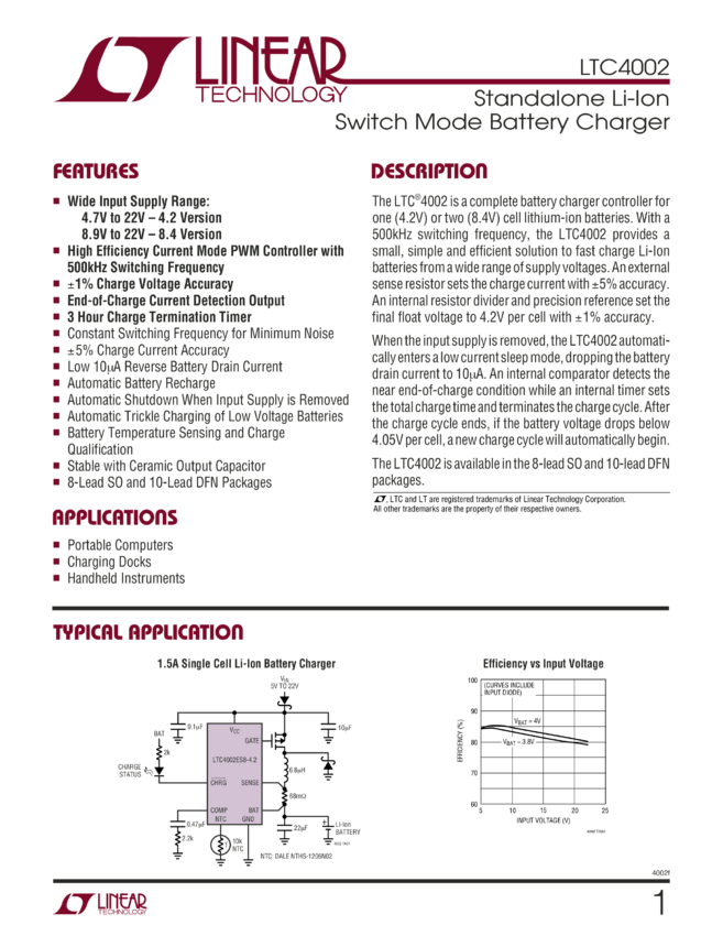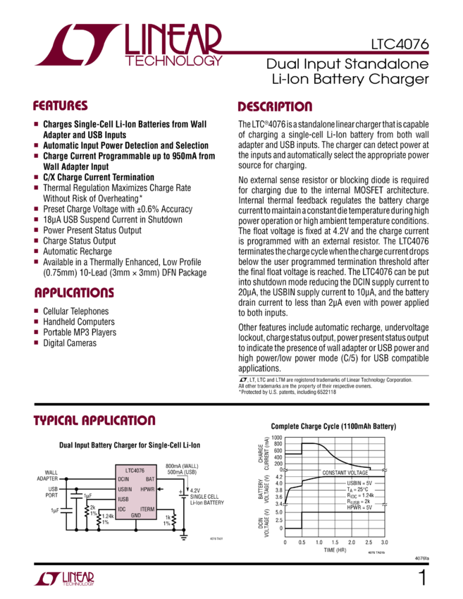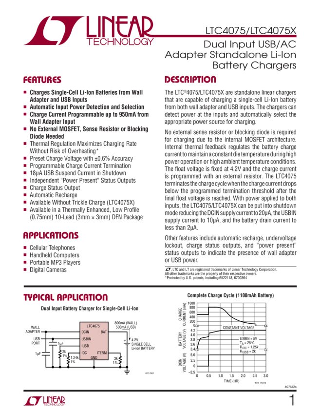 Dual Input USB/AC Adapter Standalone Li-Ion Battery Chargers