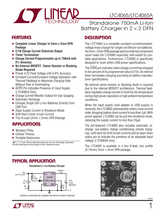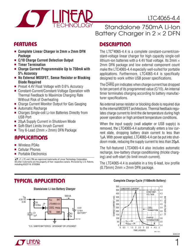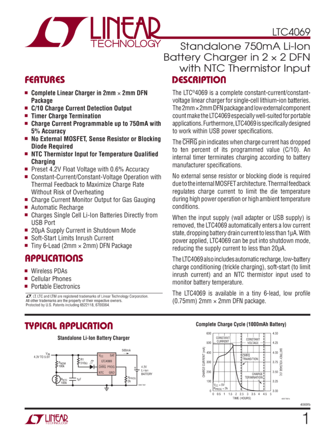 Standalone 750mA Li-Ion Battery Charger in 2 x 2 DFN with NTC Thermistor Input