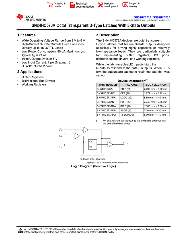 Układ scalony; SN74HC573AN; IC; cyfrowy; 3-stanowy, zatrzask D; 2-6V DC; DIP20; THT; TEXAS INSTRUMENTS; RoHS