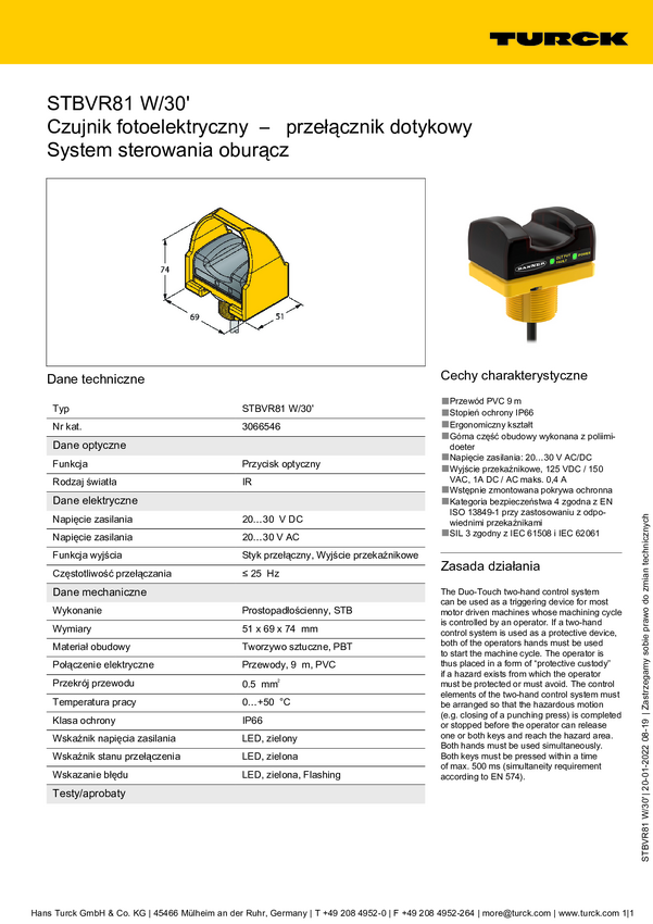 Przycisk dotykowy Turck STBVR81 W/30' 3066546 1 szt.