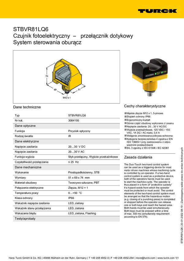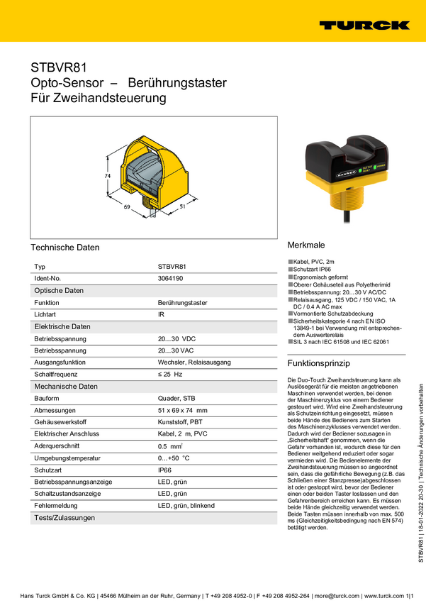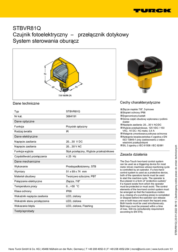 Przycisk dotykowy Turck STBVR81 3064190 1 szt.