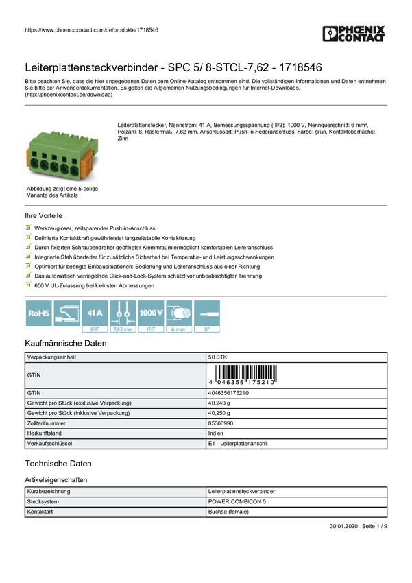 Phoenix Contact 1718546 Obudowa złącza pin żeńskiego na kabel SPC 5/ 8-STCL-7,62, piny: 8, 41 A, 50 szt.