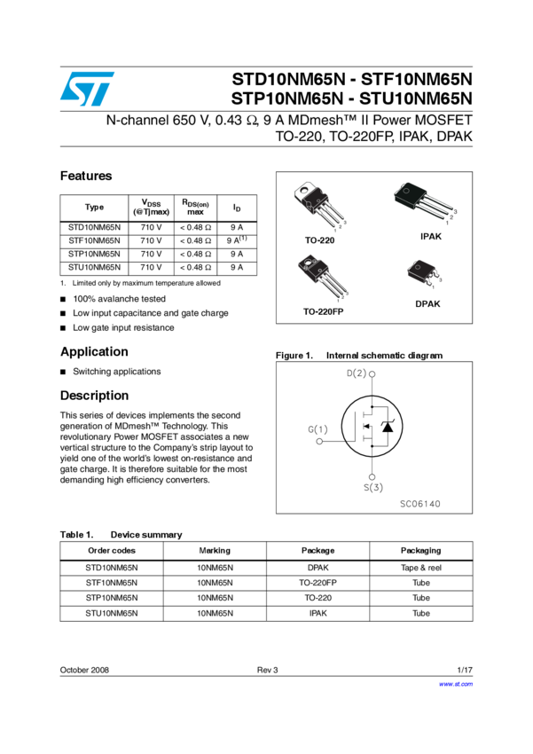 Tranzystor; STD10NM60N; N-MOSFET; 5A; 600V; 70W; 550mOhm; unipolarny; DPAK; TO252; SMD; ST Microelectronics; RoHS