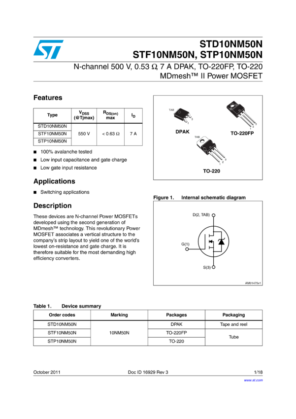 N-channel 500 V, 0.53 Ohm, 7 A DPAK MDmesh(TM) II Power MOSFET
