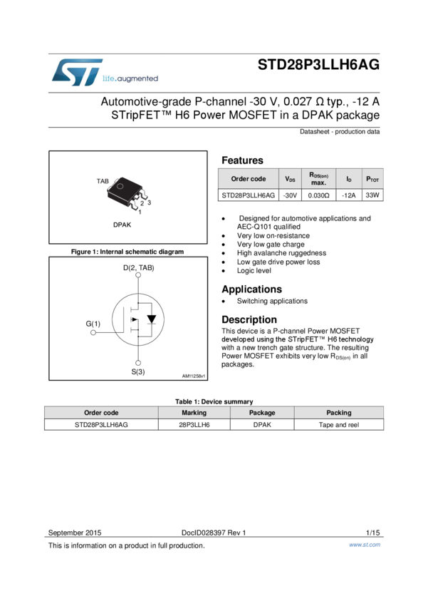 Automotive-grade P-channel -30 V, 0.027 Ohm typ., -12 A, STripFET H6 Power MOSFET in a DPAK package