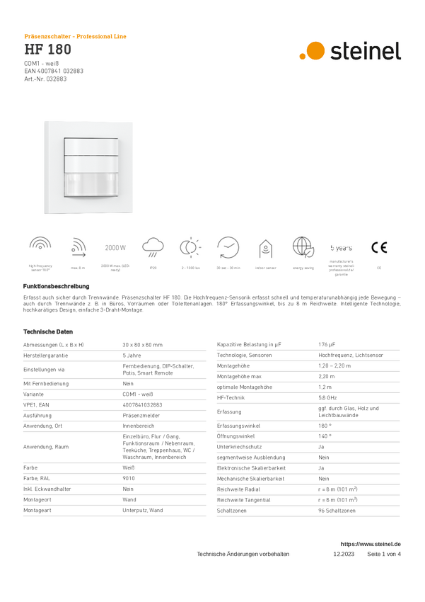Czujnik ruchu HF Steinel 032883 180 ° IP20 biały