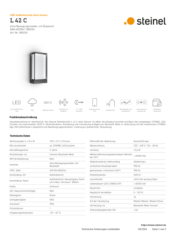 Zewnętrzna lampa ścienna Steinel LED AUSSENLEUCHTE L 42 C ANT 085254 12.6 W 871 lm IP54