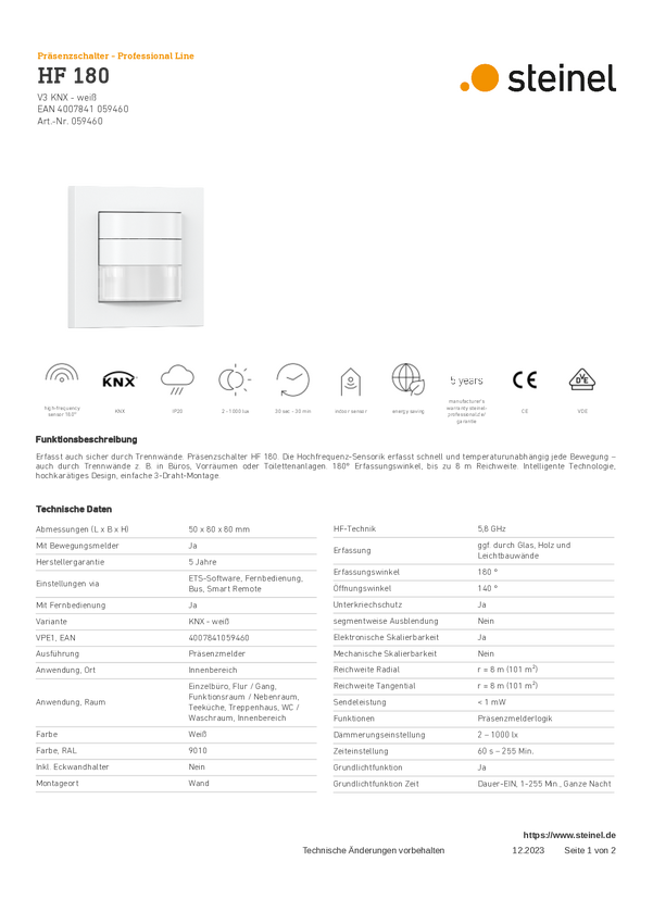 Czujnik ruchu HF Steinel 059460 180 ° IP20 biały