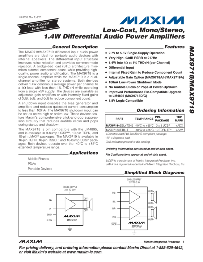 MAX9718, MAX9719 Low-Cost, Mono/Stereo, 1.4W Differential Audio Power Amplifiers
