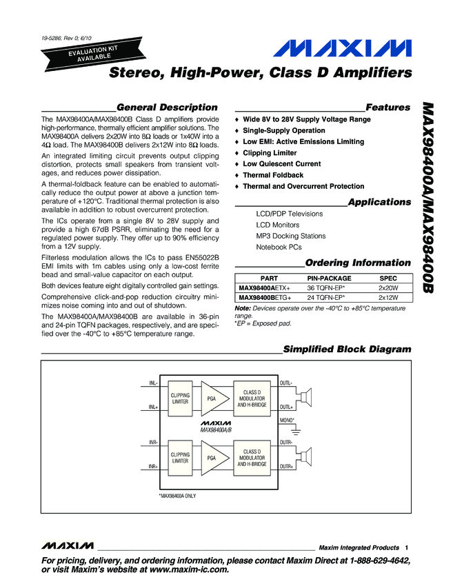 MAX9708 20W/40W, Filterless, Spread-Spectrum, Mono/Stereo, Class D Amplifier