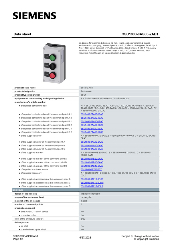 Obudowa do urządzenia sterującego Siemens 3SU1803-0AS00-2AB1 1 szt.