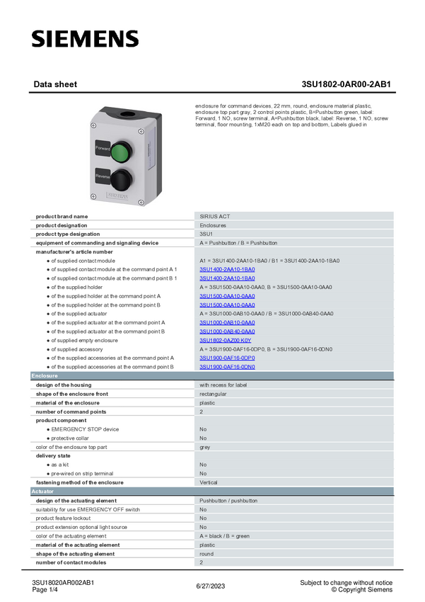Obudowa do urządzenia sterującego Siemens 3SU1803-0AR00-2AB1 1 szt.