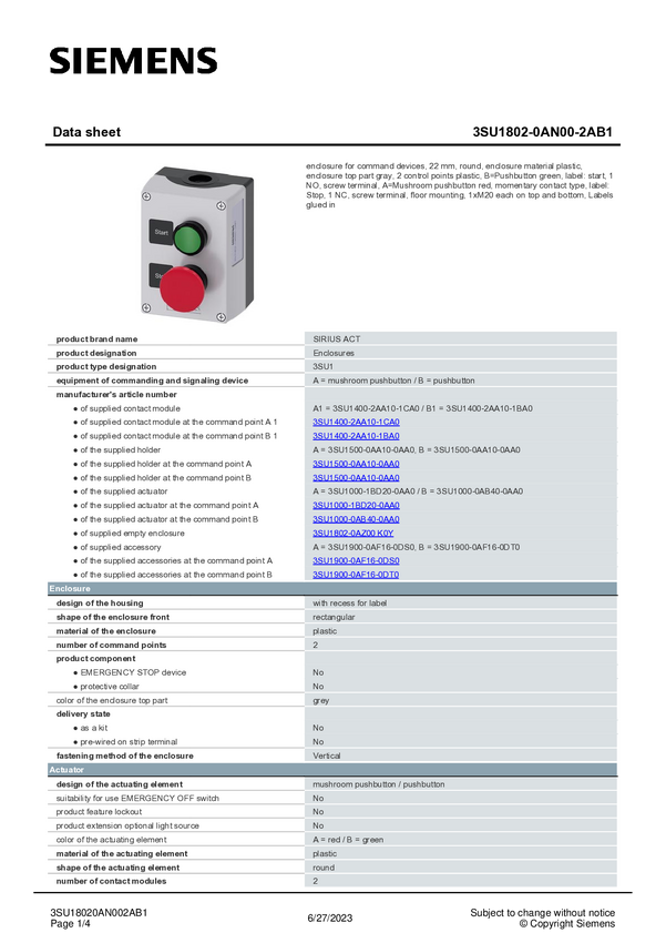 Obudowa do urządzenia sterującego Siemens 3SU1852-0AD00-4NB1 1 szt.