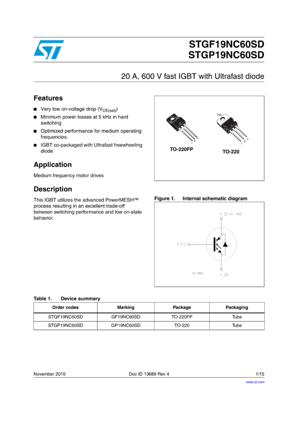 Tranzysor IGBT STMicroelectronics STGP10NC60KD N/A N/A