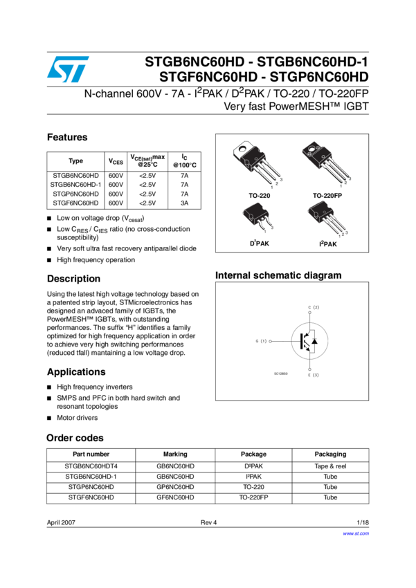 Tranzysor IGBT STMicroelectronics STGP7NC60HD N/A N/A