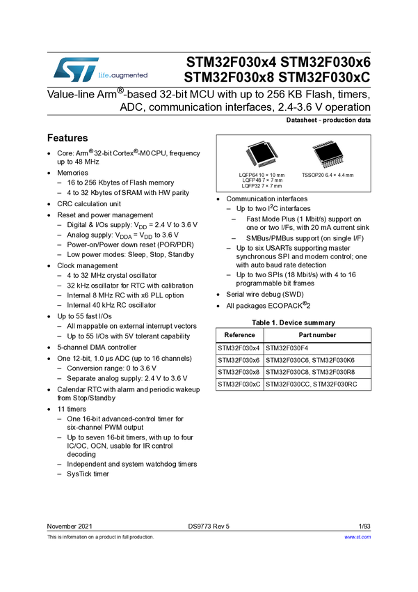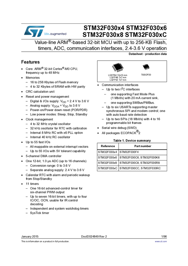Mikrokontroler; STM32 ARM; 48MHz; LQFP64; 2,4-3,6V DC; STM32F0; IC; STM32F030R8T6; STMicroelectronics; RoHS