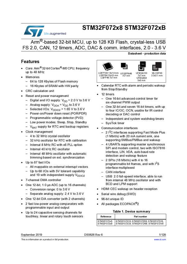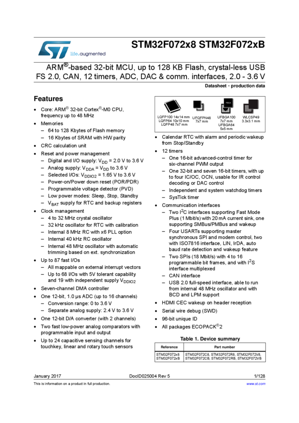 Entry-level ARM Cortex-M0 MCU with 128 Kbytes Flash, 48 MHz CPU, USB, CAN and CEC functions