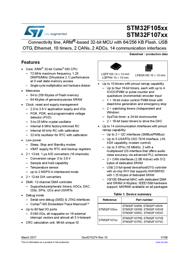 Mainstream Connectivity line, ARM Cortex-M3 MCU with 256 Kbytes Flash, 72 MHz CPU, Ethernet MAC, CAN and USB 2.0 OTG