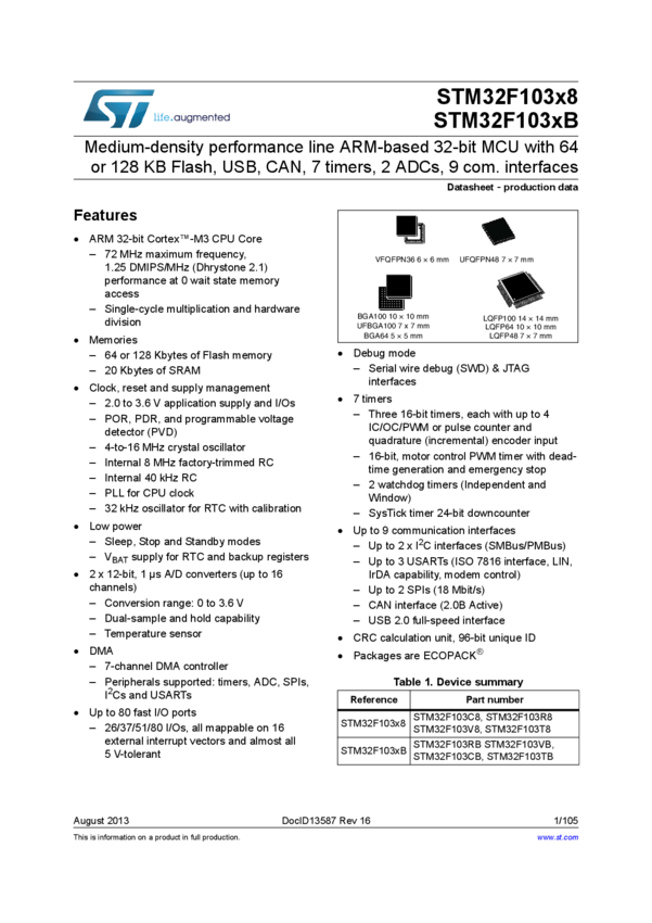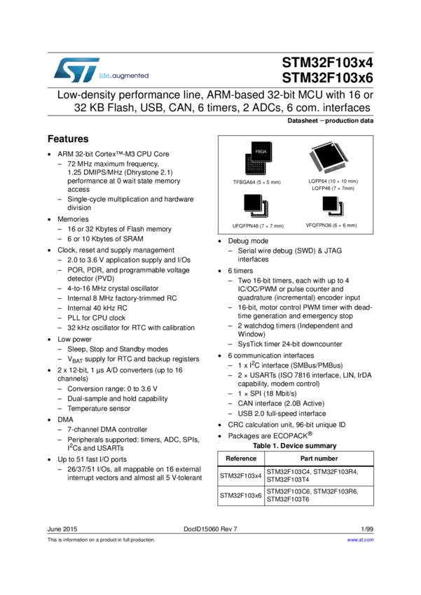 Mainstream Performance line, ARM Cortex-M3 MCU with 16 Kbytes Flash, 72 MHz CPU, motor control, USB and CAN