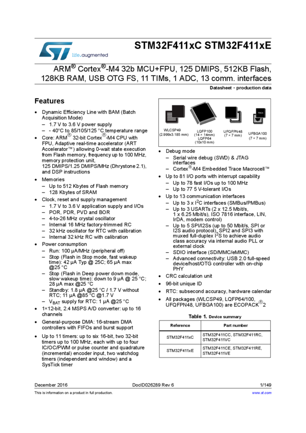 STM32 Dynamic Efficiency MCU, High-performance and DSP with FPU, ARM Cortex-M4 MCU with 512 Kbytes Flash, 100 MHz CPU, Art Accelerator