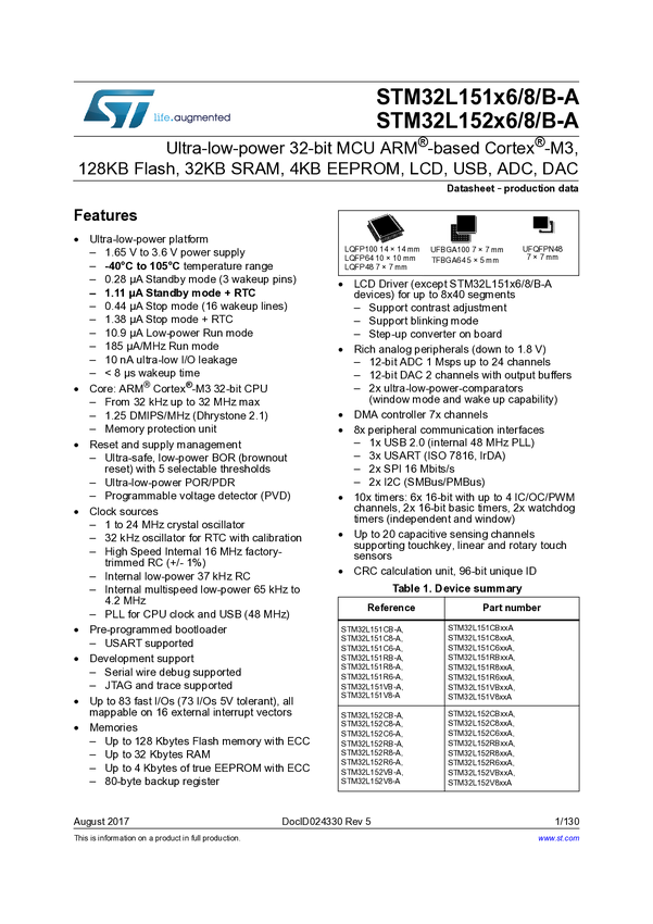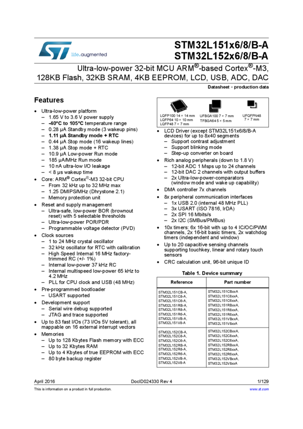 Ultra-low-power ARM Cortex-M3 MCU with 128 Kbytes Flash, 32 MHz CPU, LCD, USB