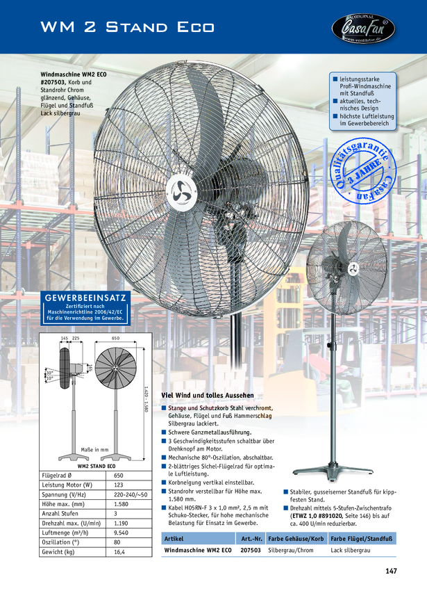 CasaFan WM2 Stand Eco Wentylator stojący 123 W (Ø x W) 65 cm x 1580 mm srebrno-szary, chrom (błyszczący) oscylacje, ruch