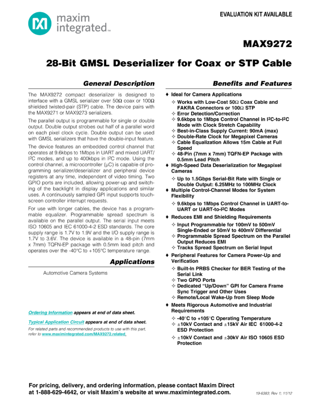 MAX9272 28-Bit GMSL Deserializer for Coax or STP Cable