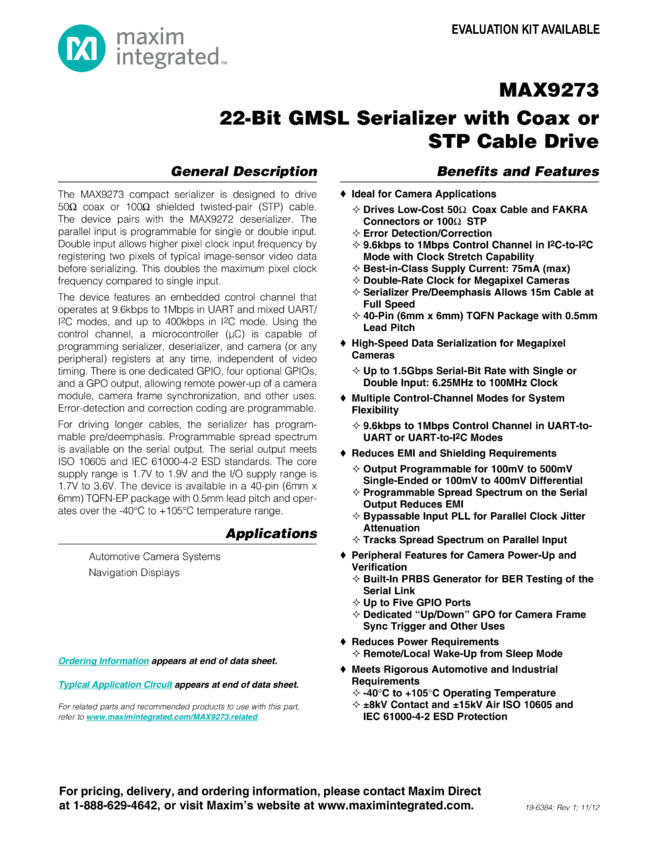 MAX9273 22-Bit GMSL Serializer with Coax or STP Cable Drive