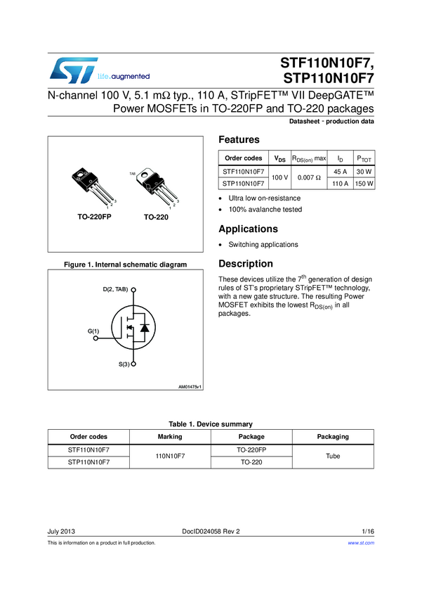 MOSFET STMicroelectronics STP110N10F7 N/A N/A