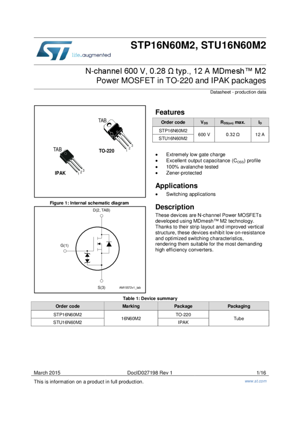 MOSFET STMicroelectronics STP16N65M5 N/A N/A