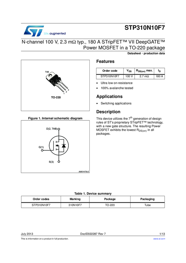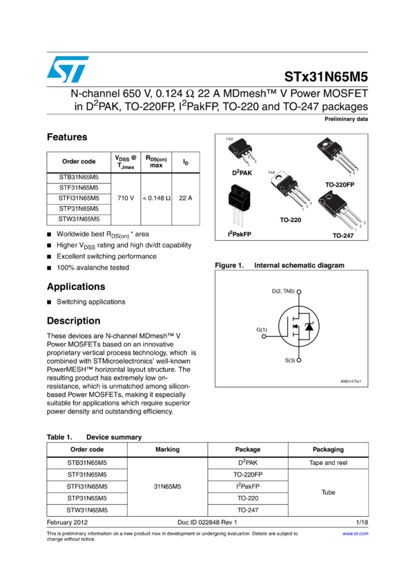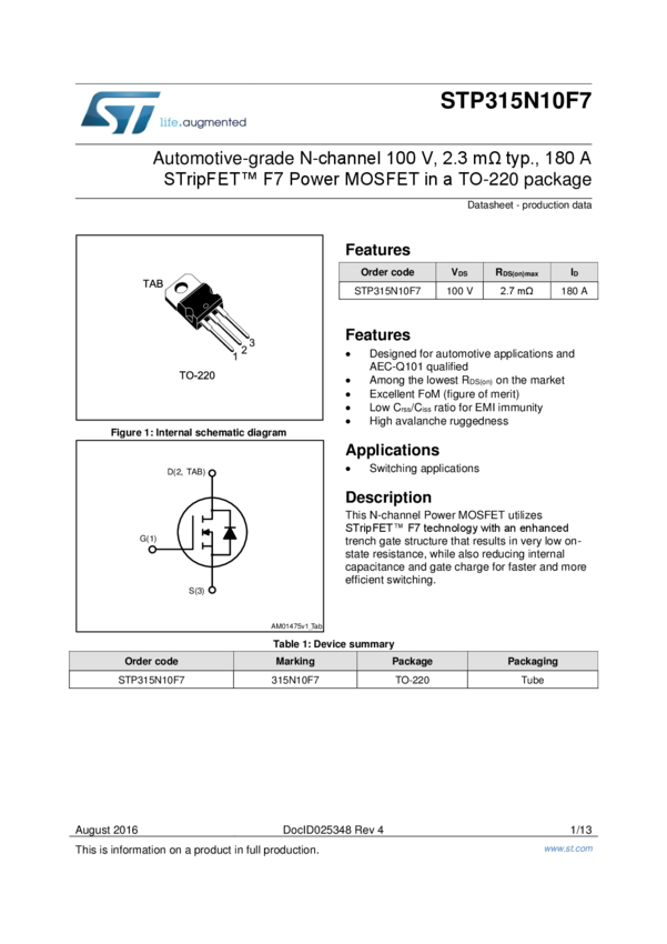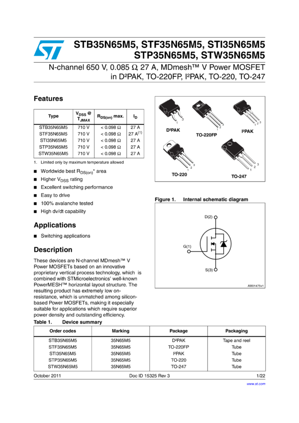 MOSFET STMicroelectronics STP30NF10 N/A N/A