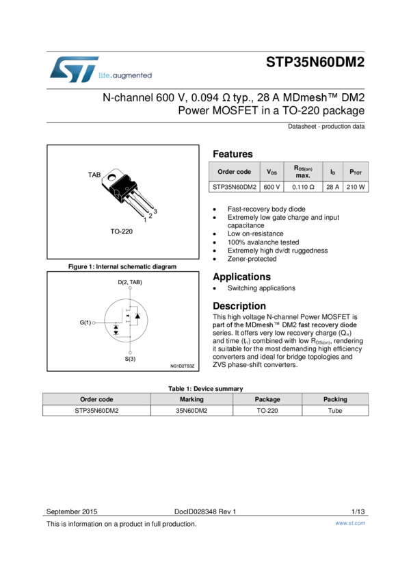 N-channel 600 V, 0.094 Ohm typ., 28 A MDmesh DM2 Power MOSFETs in TO-220 package