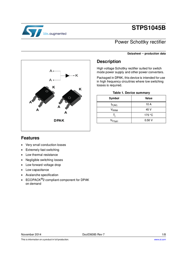 Dioda; prostownicza; 10A; 45V; SCHOTTKY; DPAK; TO252; SMD; ST Microelectronics; STPS1045B; RoHS